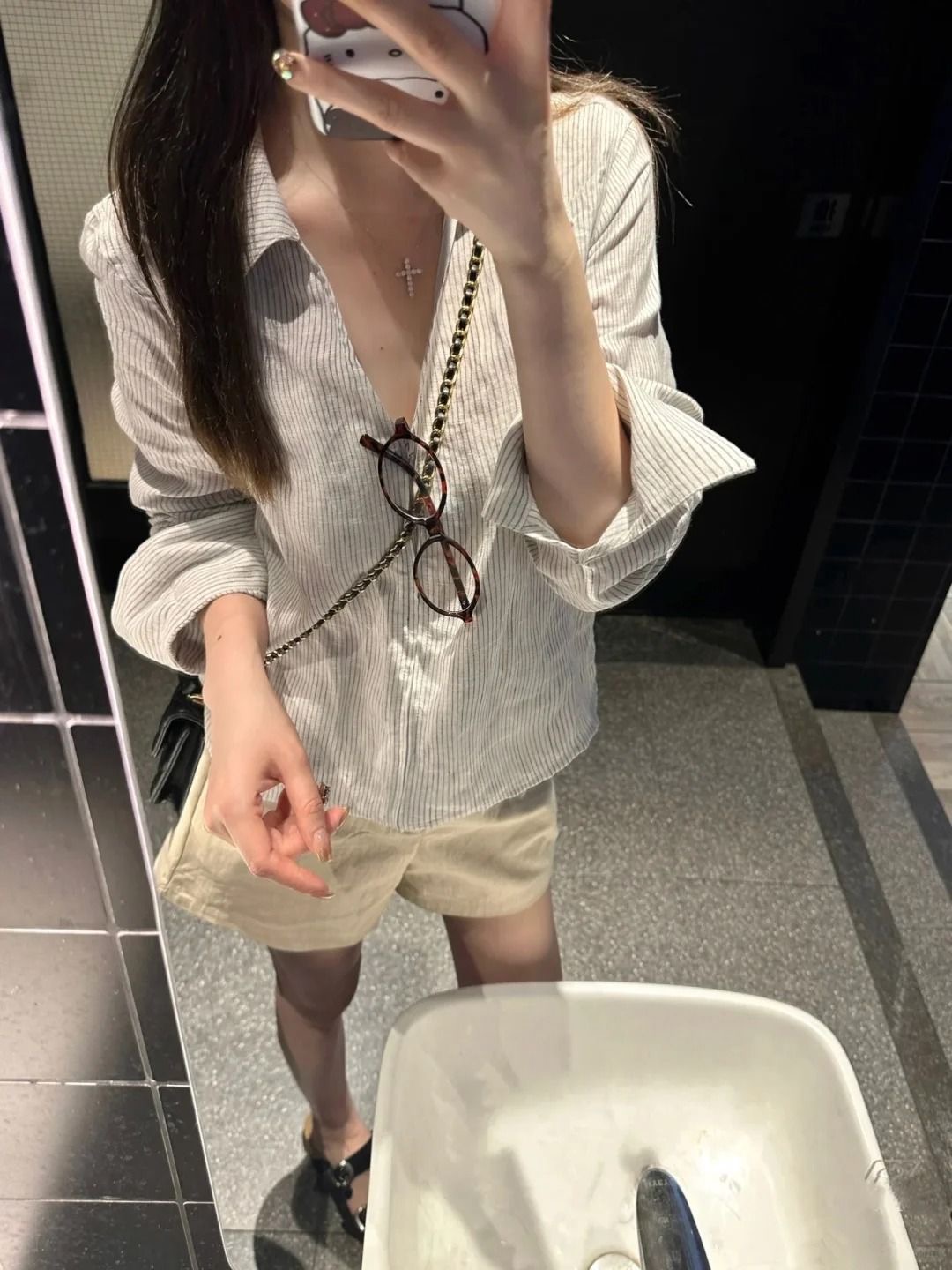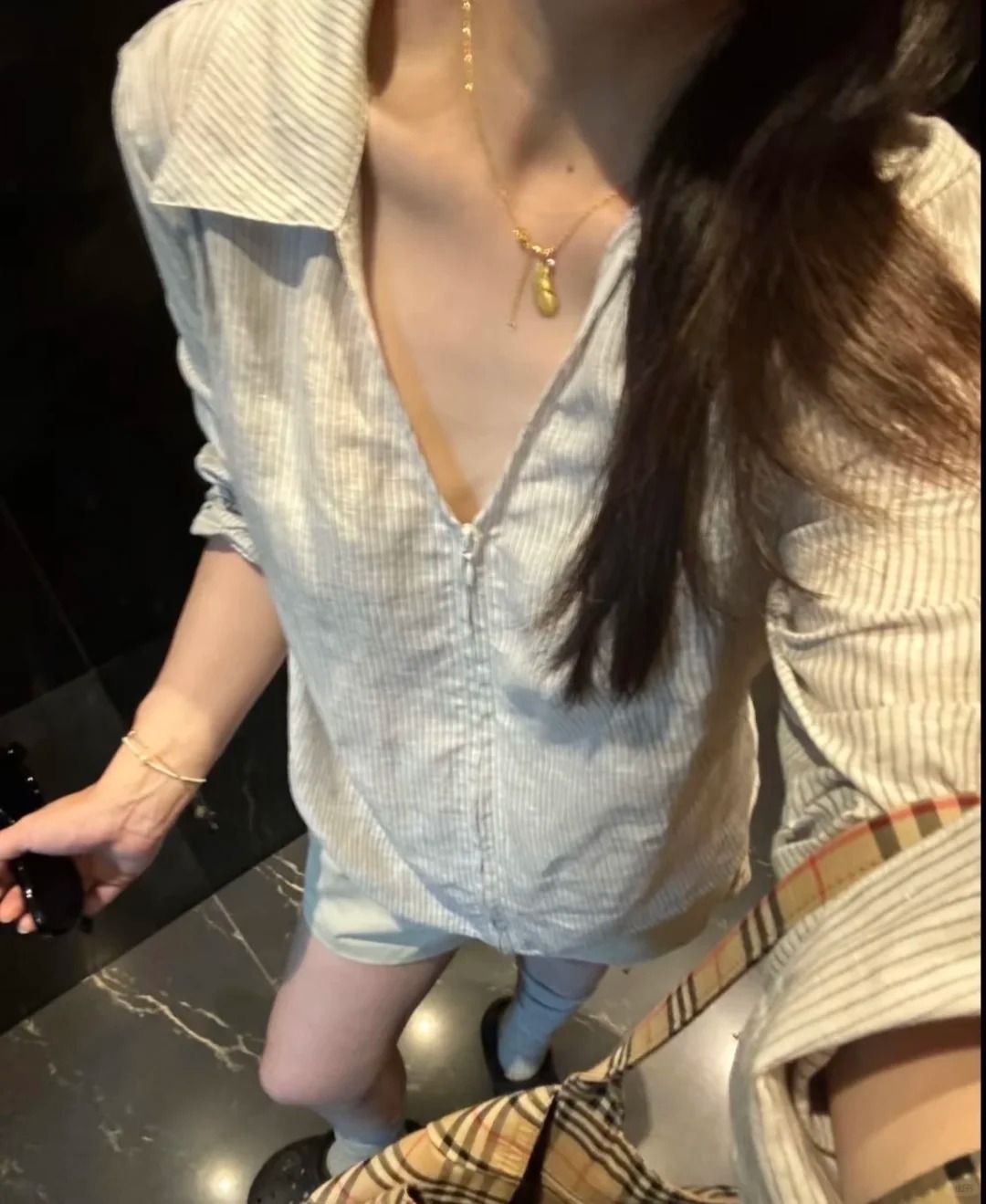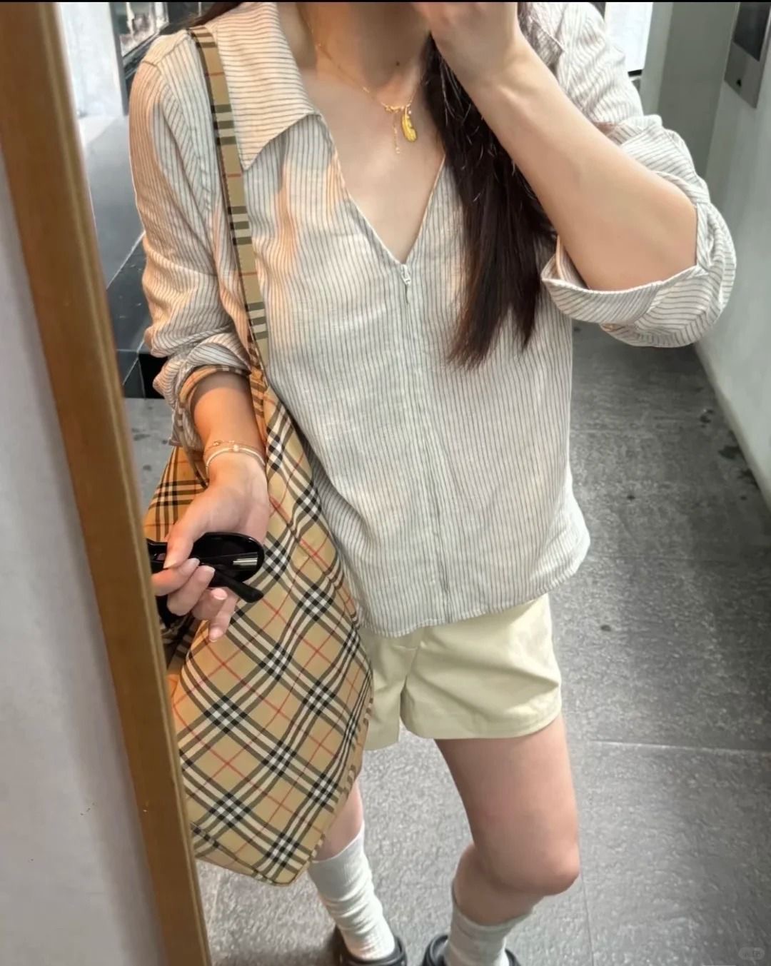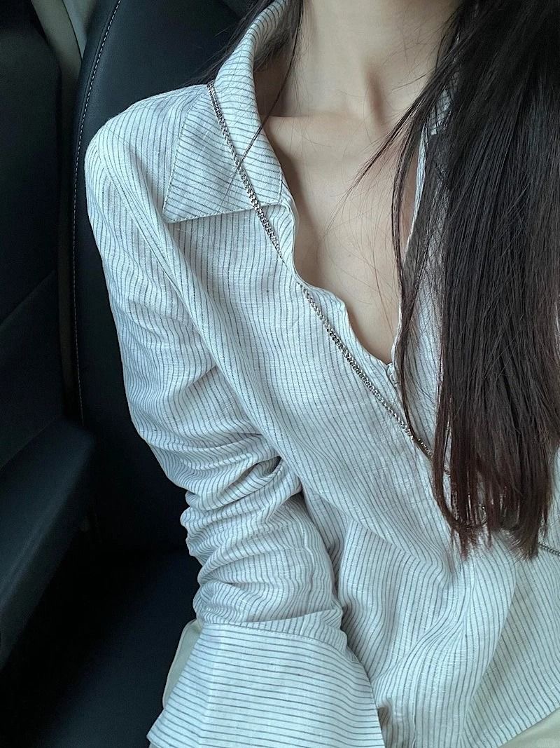 早秋新款寬鬆休閒襯衫 | 拉鍊條紋翻領通勤上衣