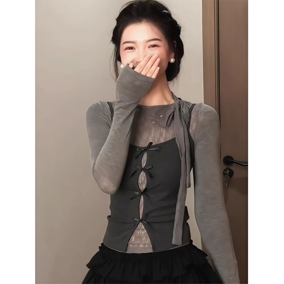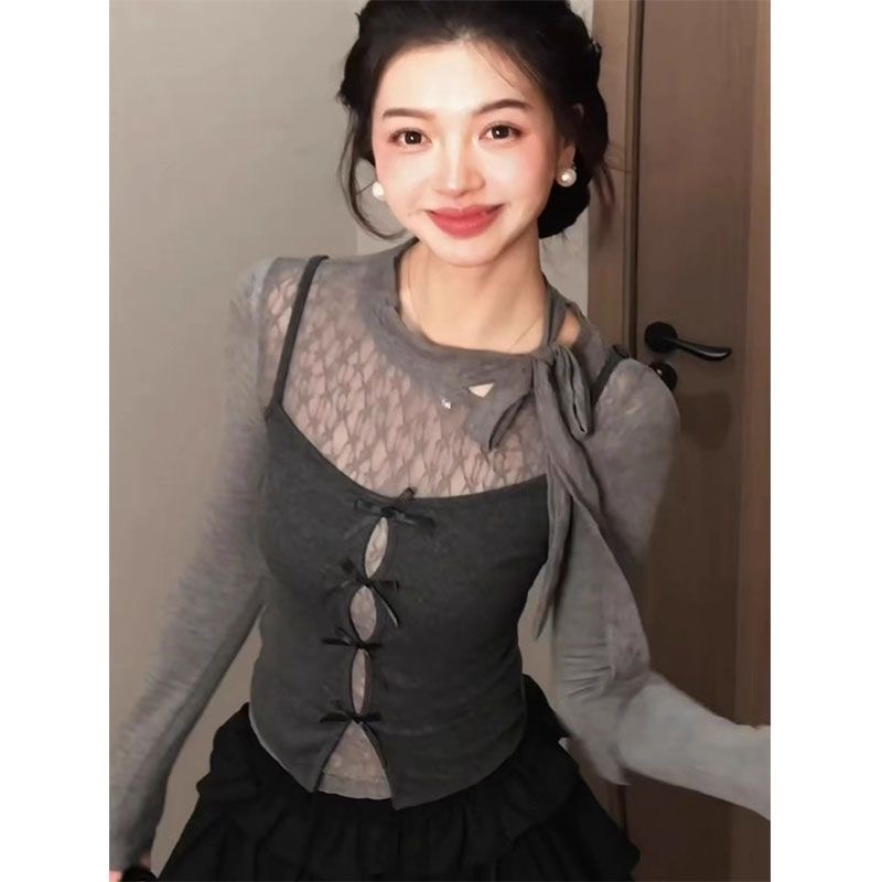 秋冬成套穿搭神器 | 韓系蝴蝶結綁帶 T 恤 | 修身顯瘦小眾短款兩件組