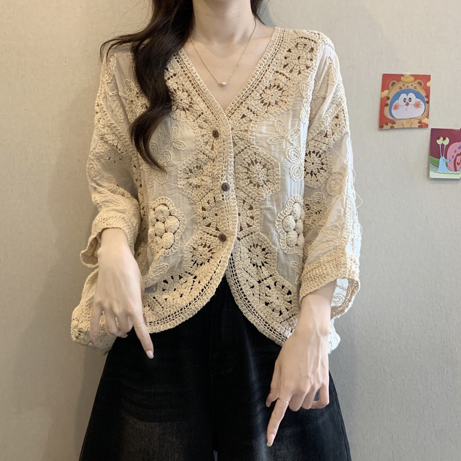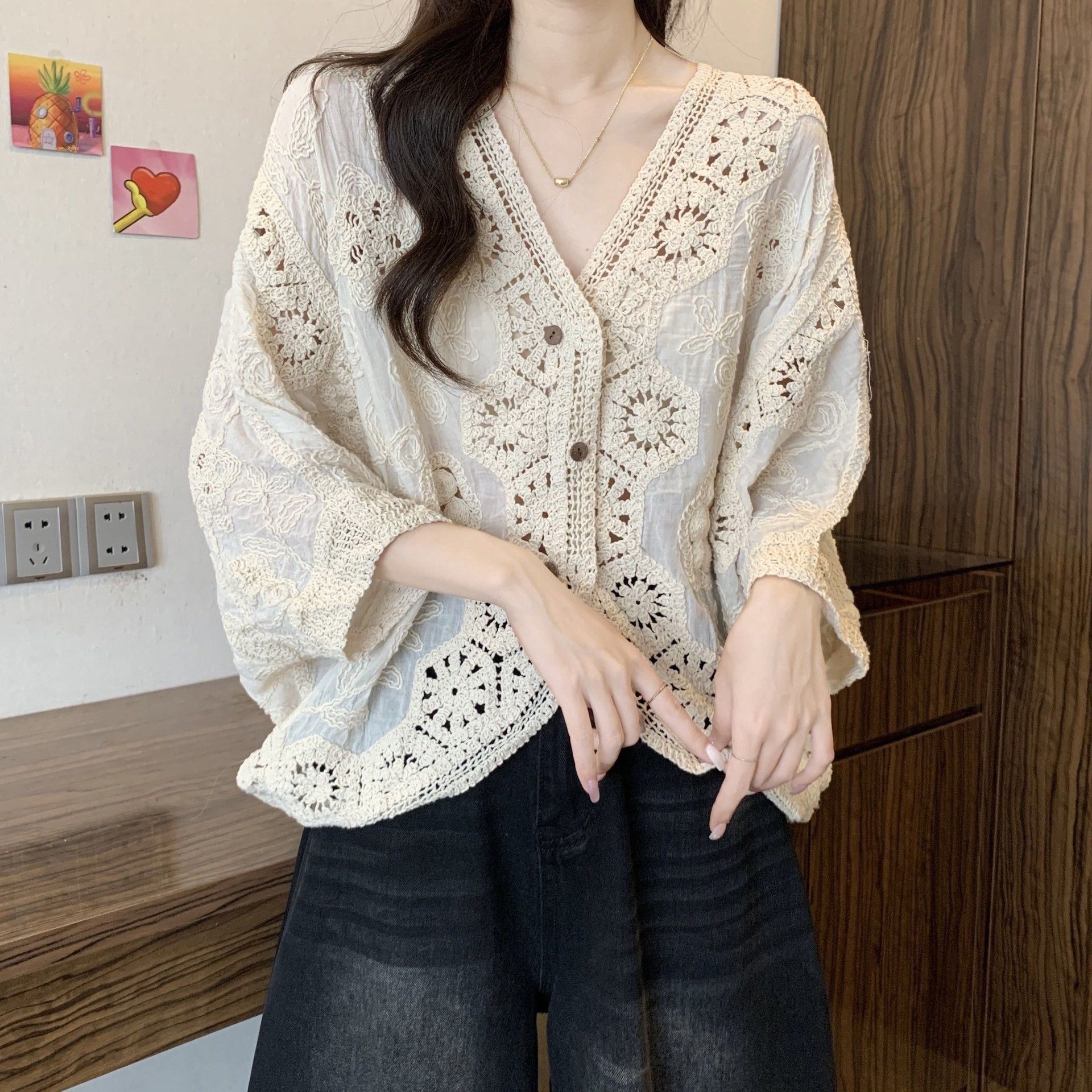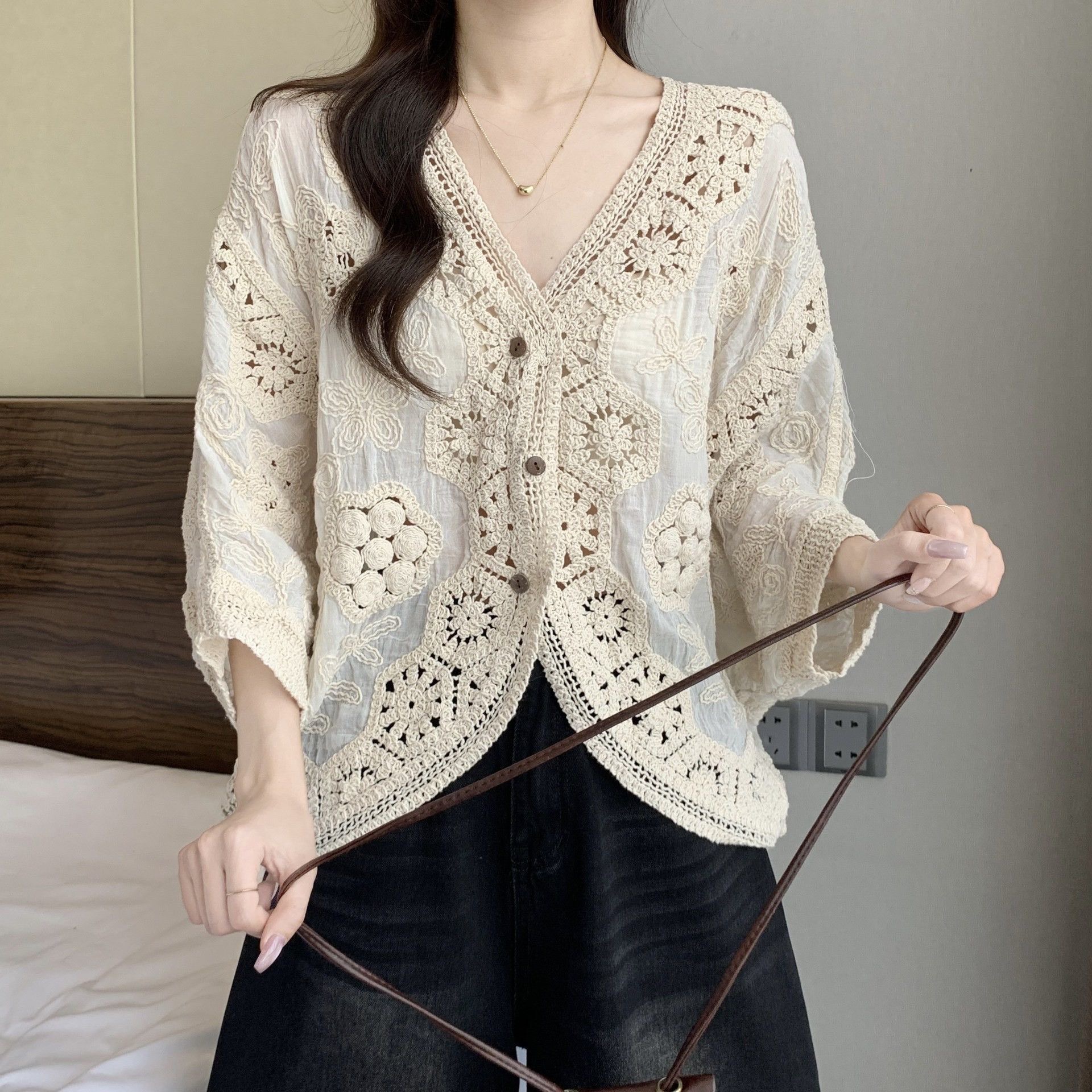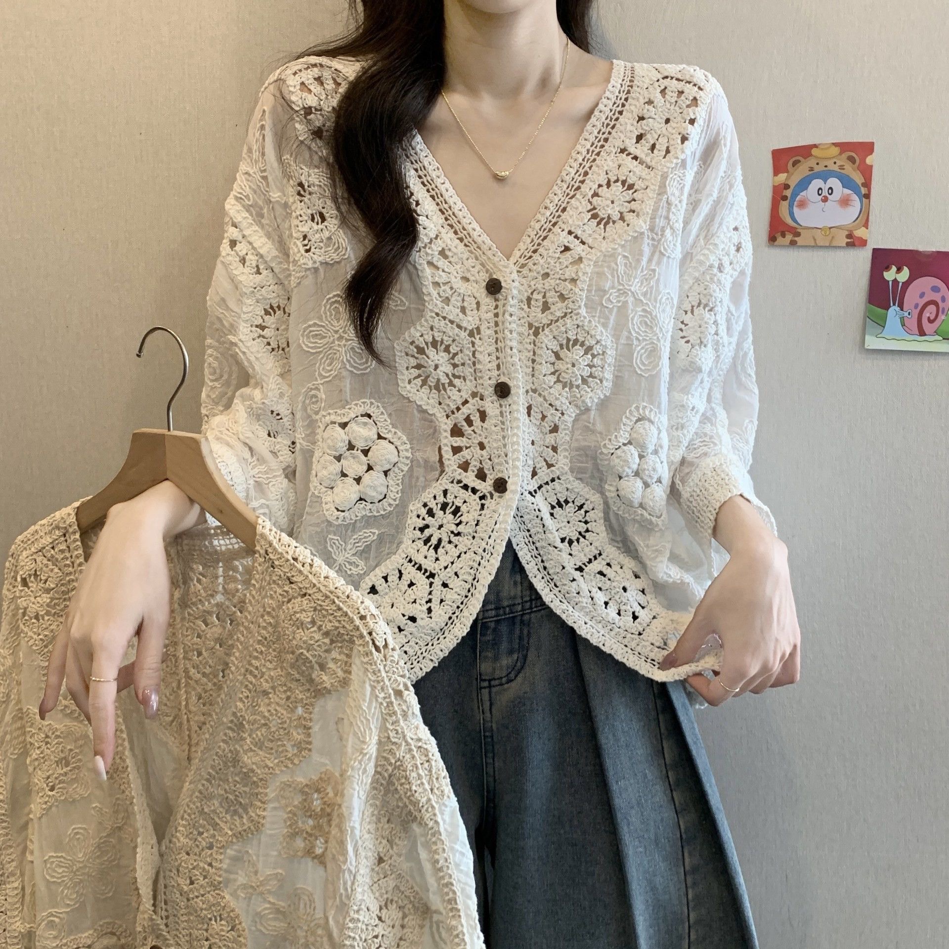 波希米亞風鉤花鏤空 V 領襯衫 女夏大尺碼遮肚防曬罩衫外套