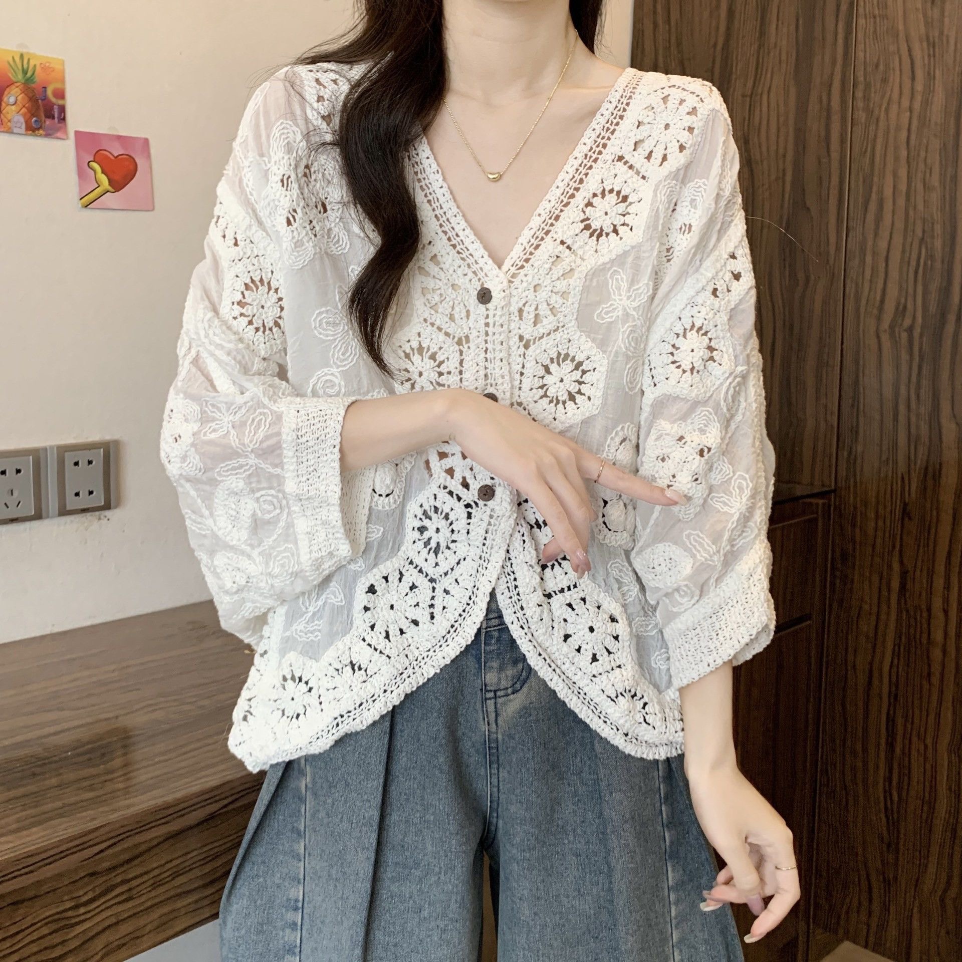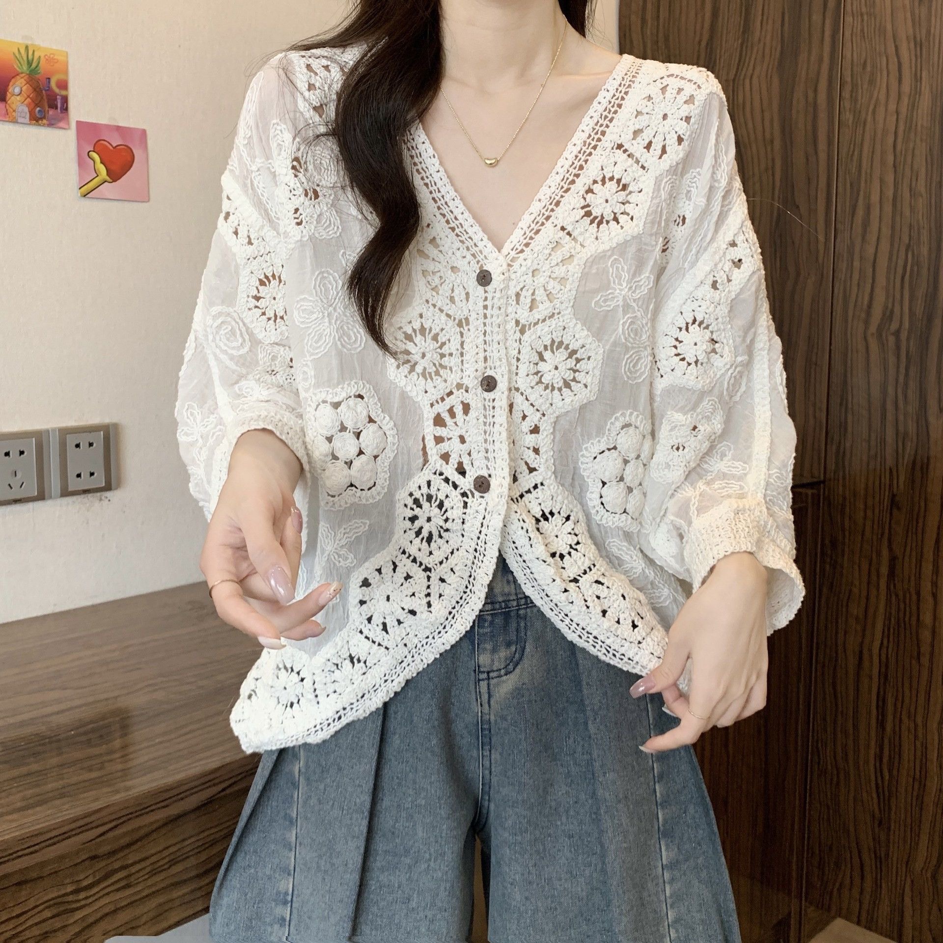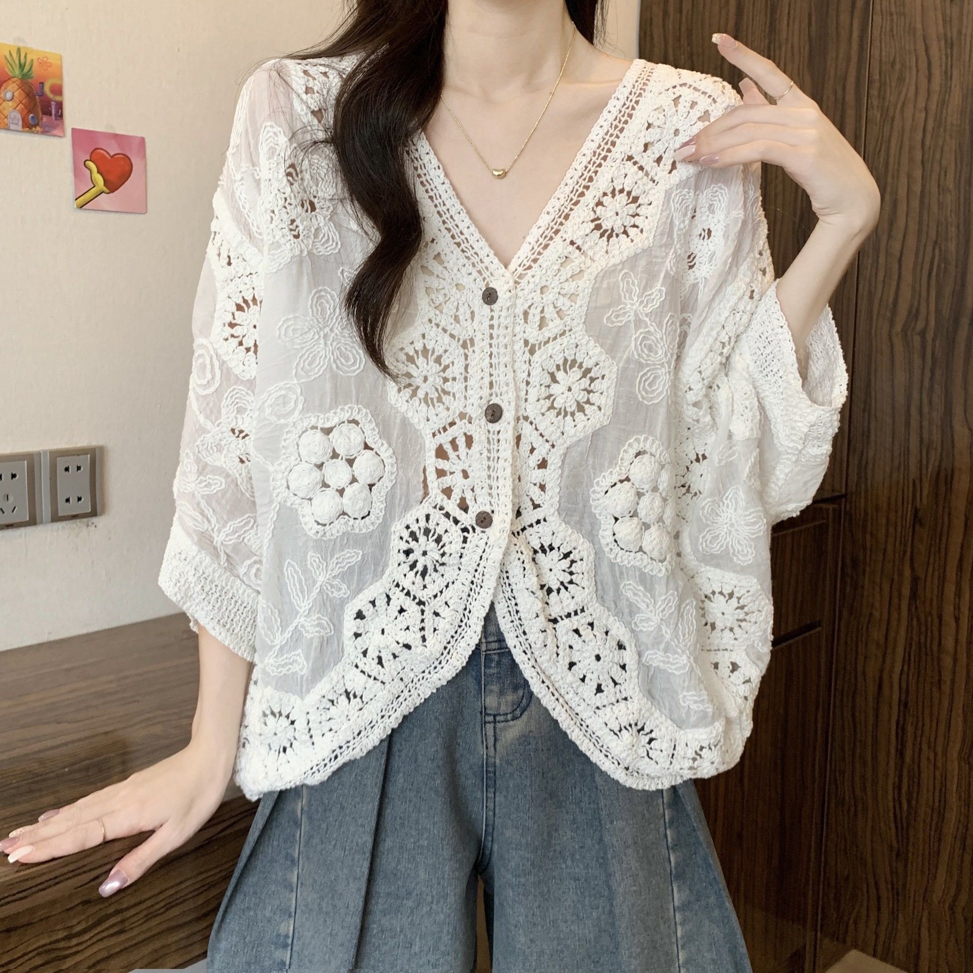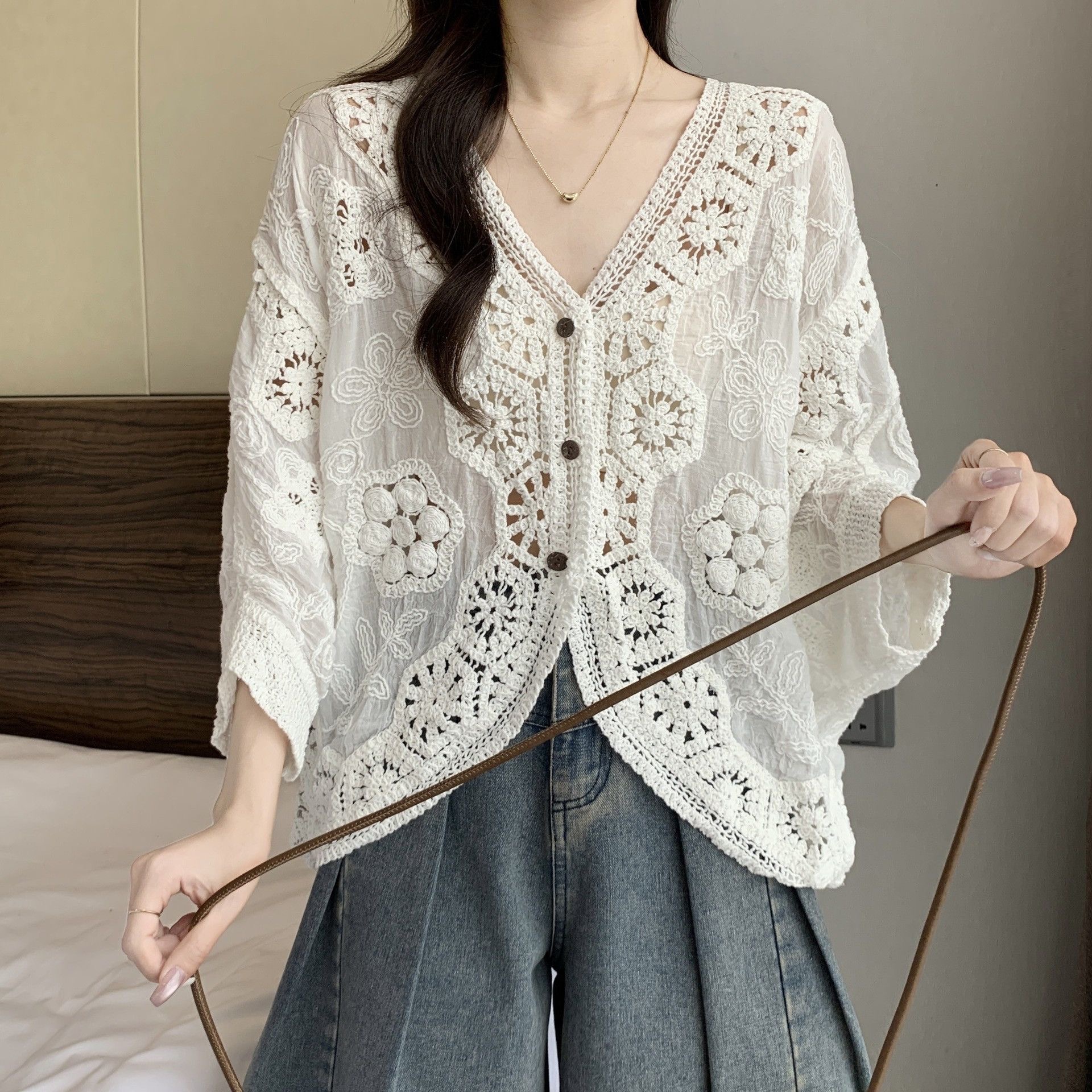 波希米亞風鉤花鏤空 V 領襯衫 女夏大尺碼遮肚防曬罩衫外套