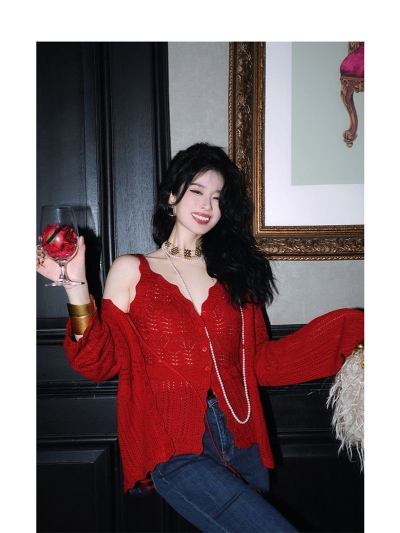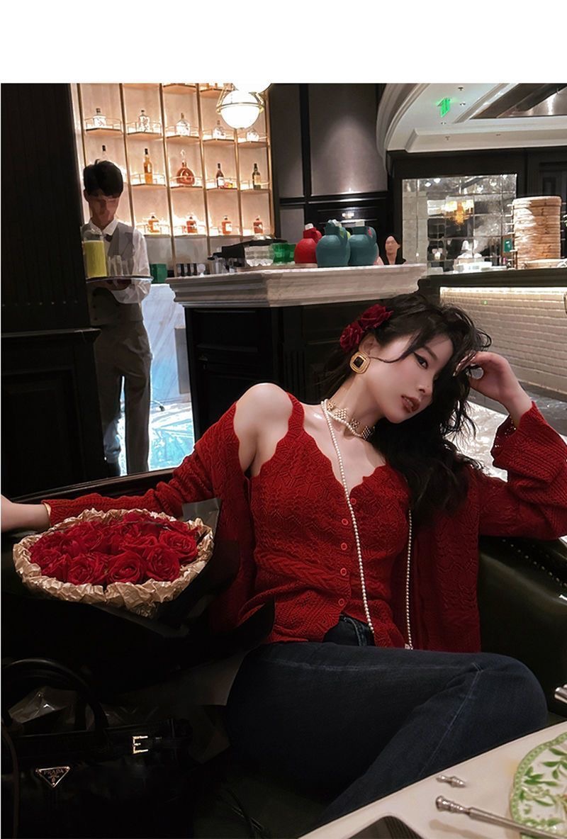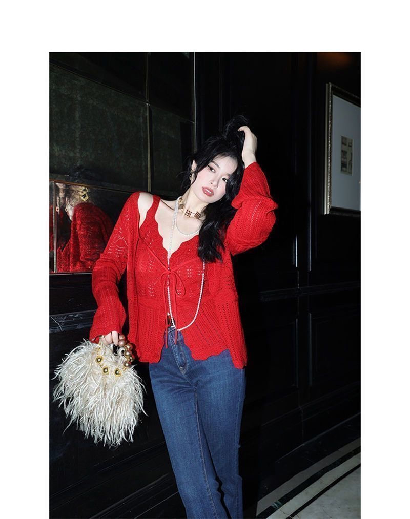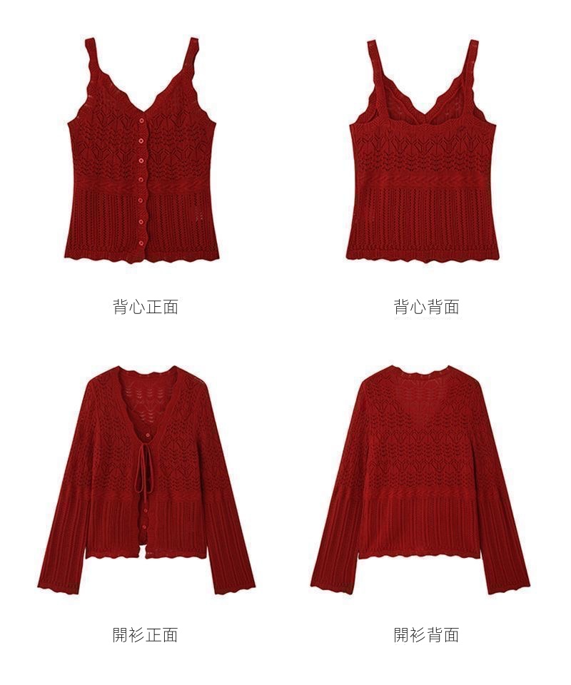 秋季新款 V 領微喇兩件組 | 法式立體提花吊帶 + 開衫時尚套組