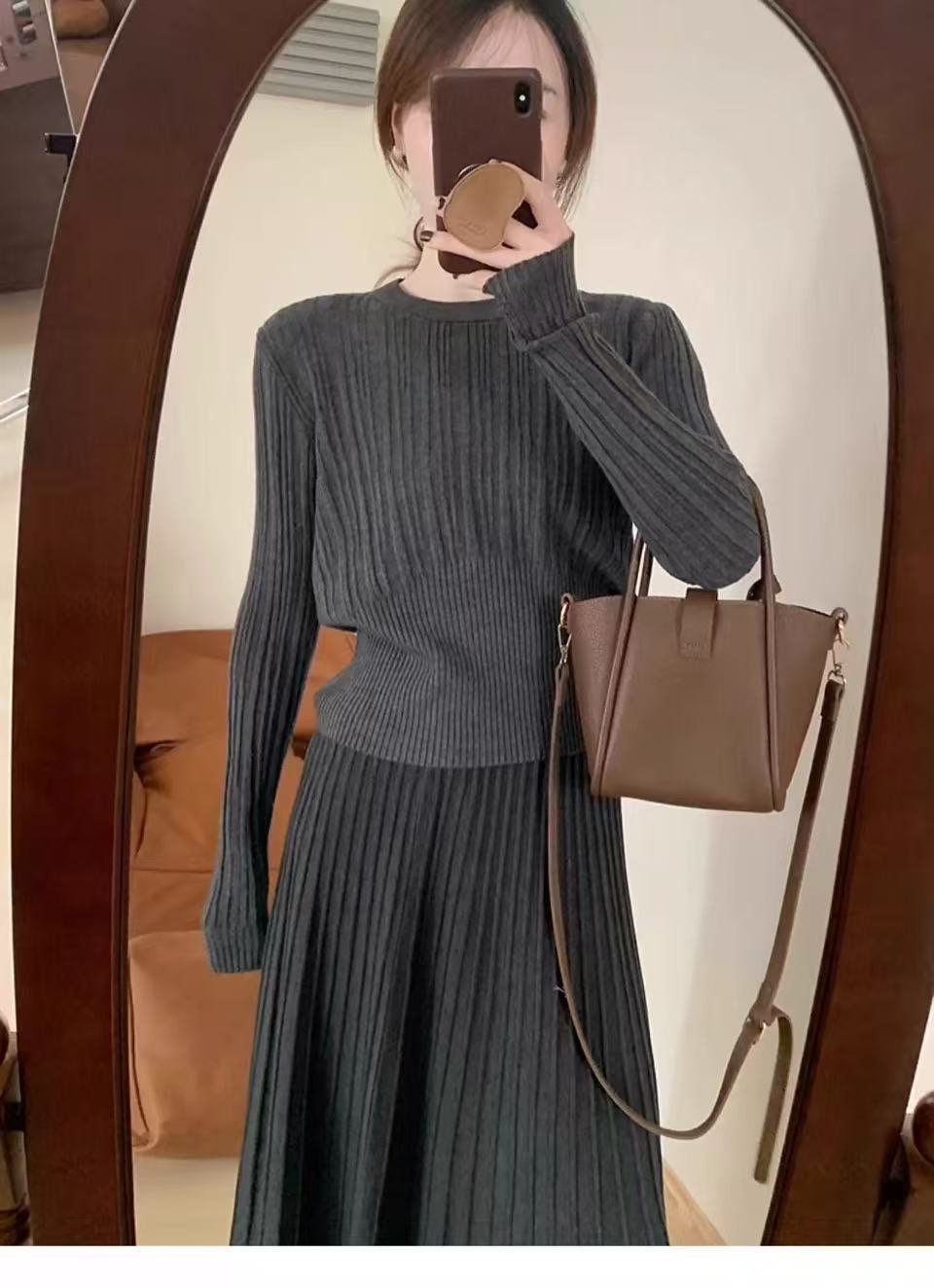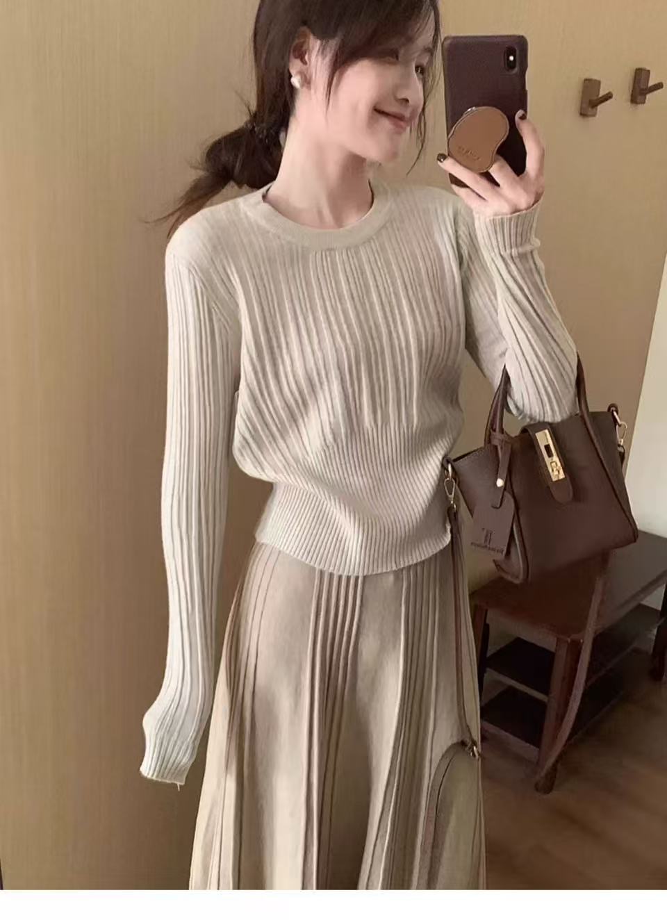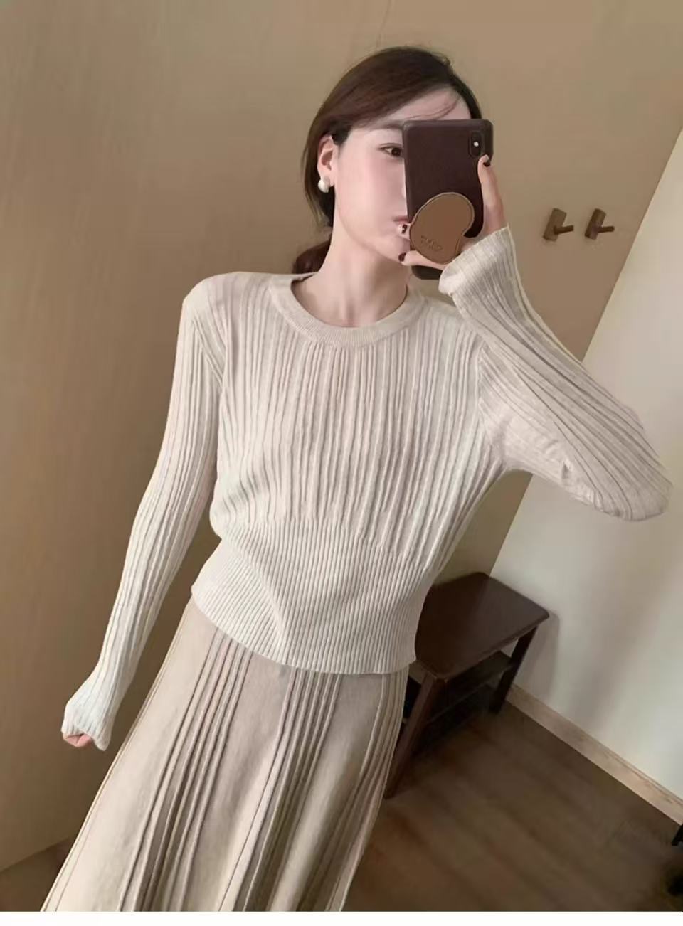 秋季新款收腰顯瘦針織套裝 | 圓領針織打底衫 + 半身裙 | 高級感穿搭
