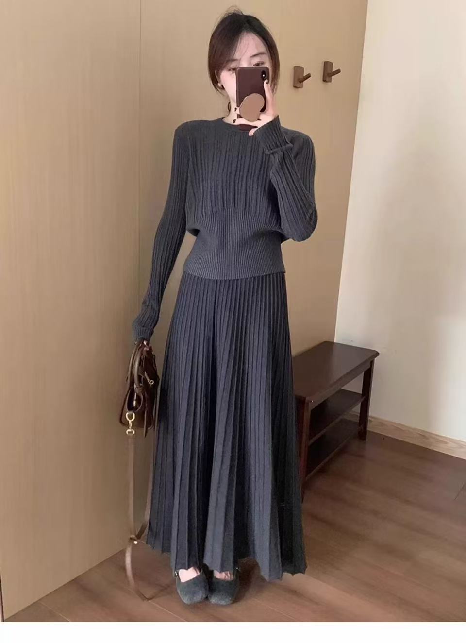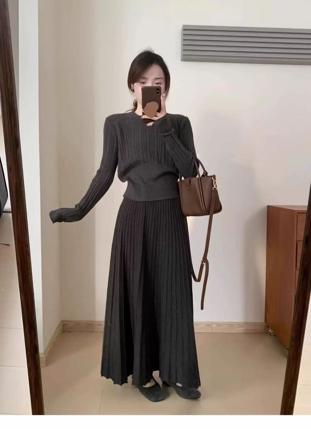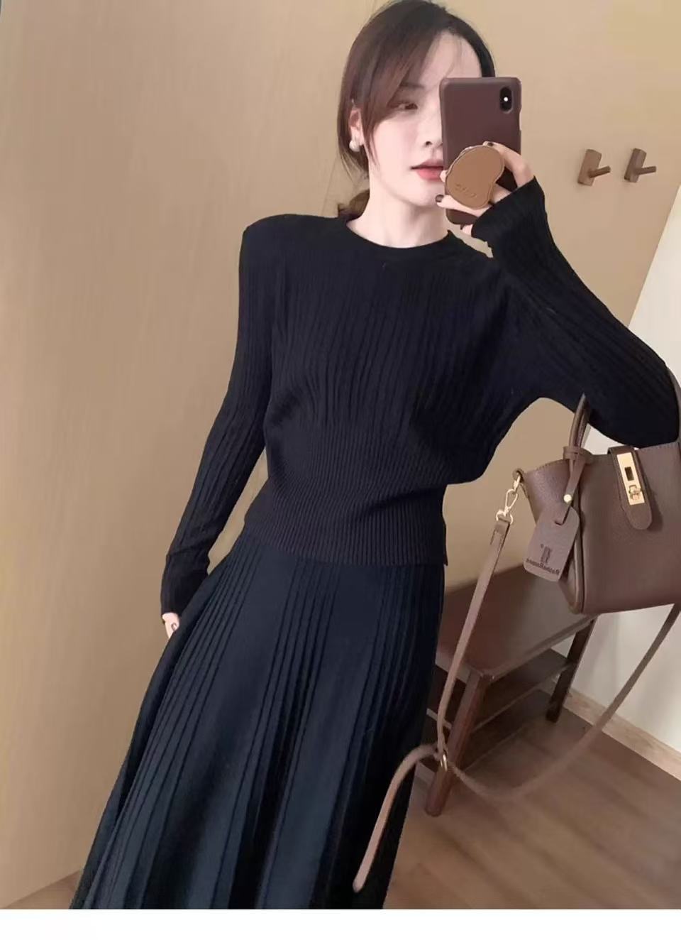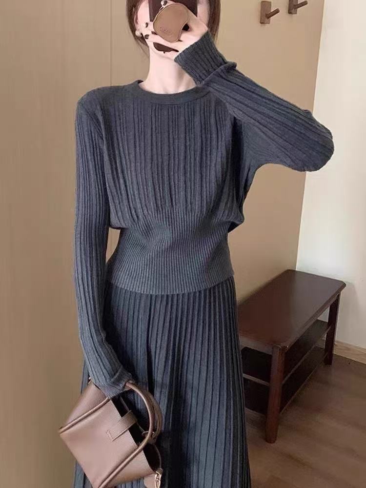 秋季新款收腰顯瘦針織套裝 | 圓領針織打底衫 + 半身裙 | 高級感穿搭