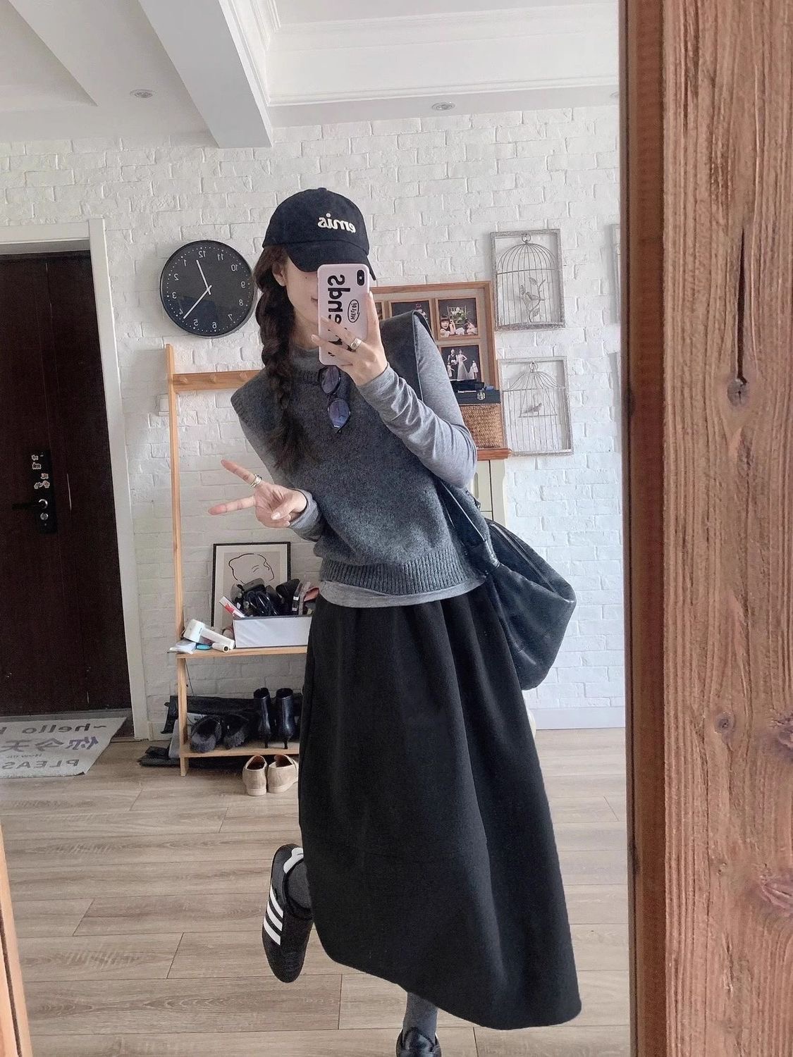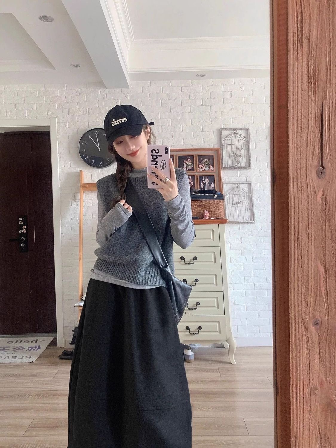 冬季新款|設計感長袖打底上衣 + 灰色圓領針織背心馬甲 + 半身裙三件組