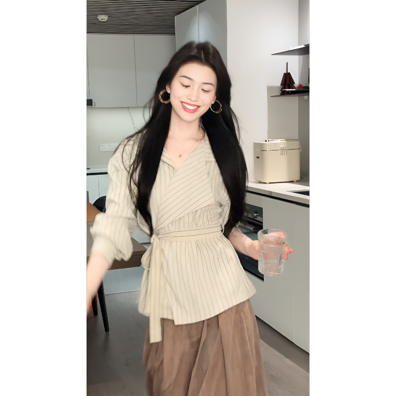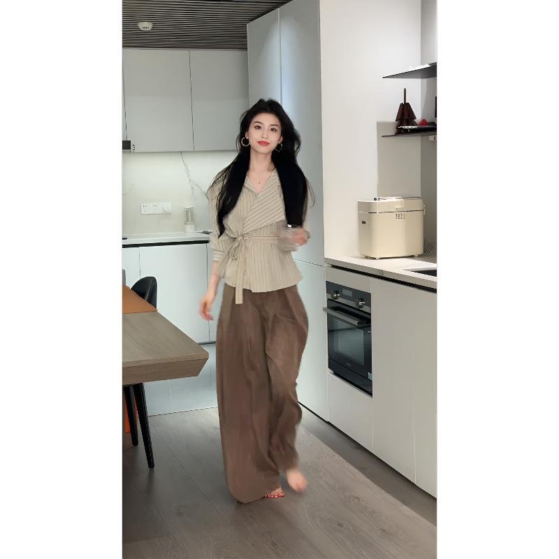 早春韓系風兩件組 設計感不規則 V 領長袖襯衫 + 闊腿褲